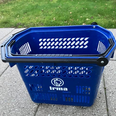 Sort plastik indkøbskurv med håndtag. Kurven har åbne riller for ventilation og er designet til at bære varer nemt og sikkert. Velegnet til dagligvareindkøb eller opbevaring.