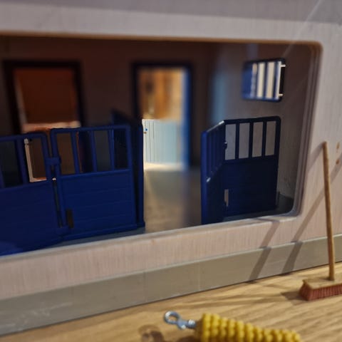 Schleich legetøjsstald med en sort hest, en rytterfigur og to hundefigurer. Stalden har et rødt tag og grå hegn. Legetøjet er designet til børn og kan bruges til rolleleg og fantasi.