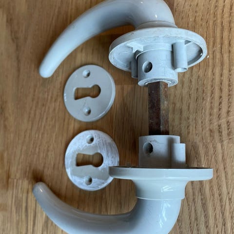 Retro dørgreb i lys farve med monteringsdele og skruer.