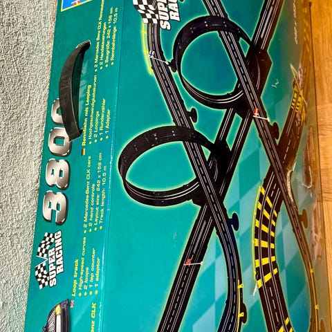 Top toy Scale-Racing børne legetøj består af et racerbane sæt med forskellige vejstykker, to fjernbetjente biler og tilhørende controllere. Sættet indeholder buede og lige vejstykker med sorte og gule vejmarkeringer, samt start- og mållinje. Legetøjet er designet til børn og kan bruges til leg og underholdning med bilræs.