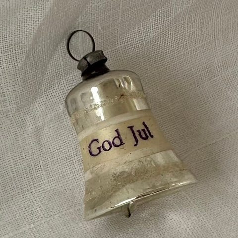 Stor og meget smuk gammel glas julekugle. Julekuglen er smukt forsølvet og Er hånddekoreret med det smukkeste klokkemotiv i fint gammelt sneglimmer.
