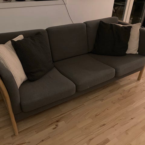 Har en 2 personers sofa med tilhørende puf fra jysk . Let brugt men der er dog kommet en plet på sofaen og puf er uden nogen plet.