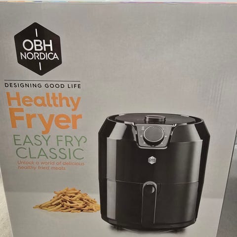 OBH Nordica Air Fryer med sort og rustfri stål finish. Inkluderer aftagelige dele og tilbehør til madlavning.