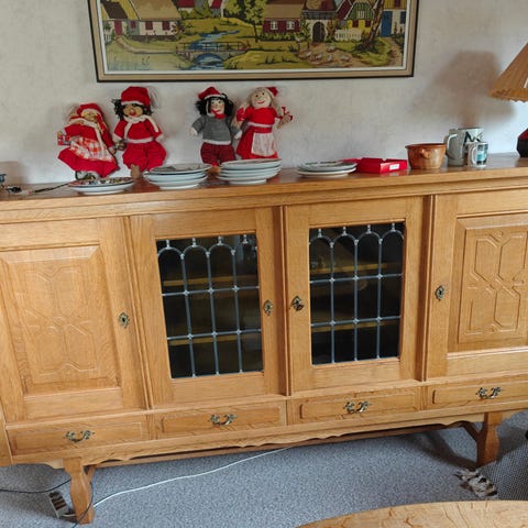 Smuk og unik egetræsskænk malet i lys grå farve, som passer ind i det moderne og klassiske hjem. Skufferne har brune retro glasgreb, der giver et charmerende vintage udtryk.