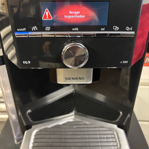 Siemens EQ.9 espressomaskine i sort og rustfrit stål. Skal repareres, da den ikke får tilført nok vand til brygheden til gennemløb gennem kaffe. Der kan være en slange som skal tætnes eller skiftes , jeg er ikke helt sikker. God kaffemaskine ellers med et væld af muligheder og meget brugervenlig betjening. Mælkeskum og varmt vand virker som det skal.