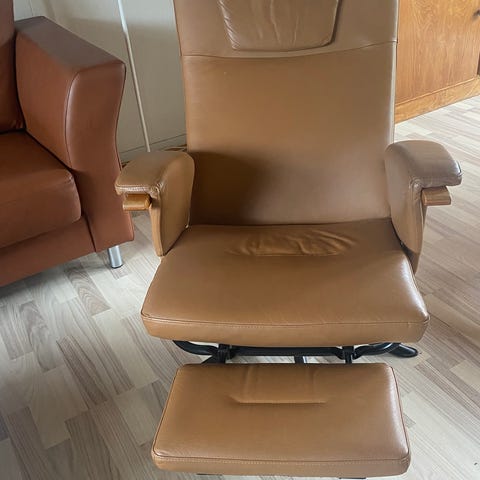 Sælger denne flotte og meget komfortable lænestol i bordeauxfarvet (vin rød) læder. Stolen har flere indstillinger/positioner, så du nemt kan læne dig tilbage og finde den perfekte sidde- eller hvilestilling. Den integrerede fodstøtte giver ekstra komfort – ideel til afslapning eller en god lur.