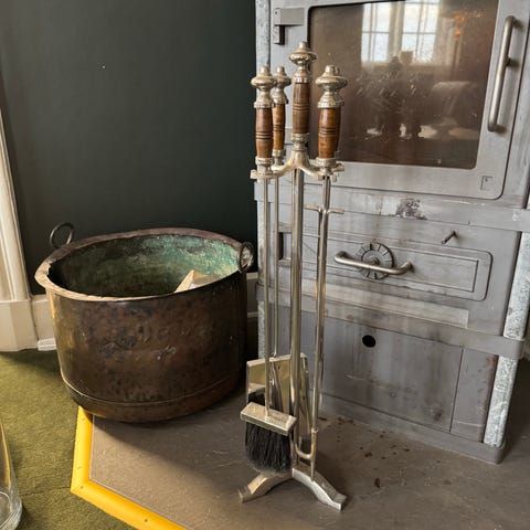 Pejsesæt / Brændeovnssæt bestående af kost, tang, skovl og poker i sort metal. Sættet leveres med et tilhørende stativ hvor de kan hænge til opbevaring. Foran er metalskærm.