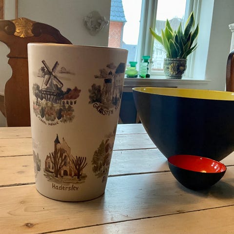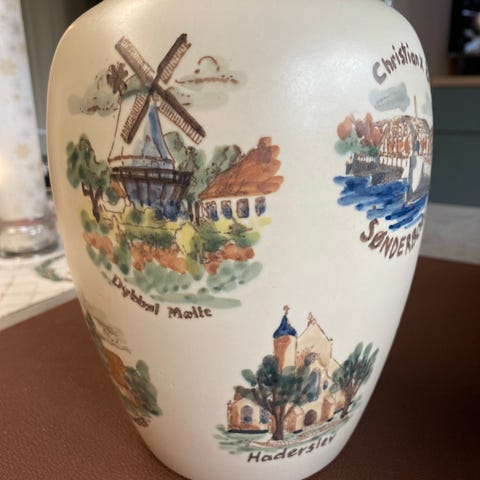 Vase, Danmarks vase, Emil Ruge, Stor flot Emil Ruge (1892-1972) keramik vase, men håndmalede motiver fra Danske byer og øer sælges. Den er 25,5 cm høj og har en diameter på ca. 17 cm. Fremstår hel og fin, uden skader.