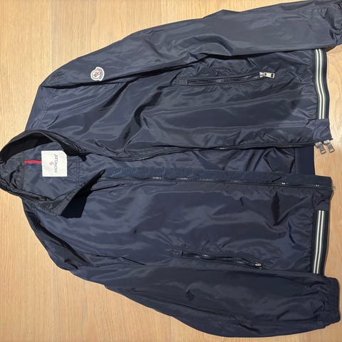 Moncler Jakke i størrelse M, lavet af dun materiale. Jakken er blå og designet til mænd. Den har en hætte og flere lommer, herunder en på ærmet med Moncler-logo.