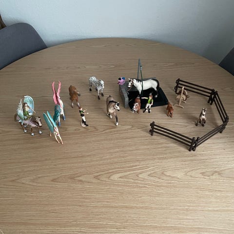Schleich hestefigurer i forskellige farver og størrelser, herunder almindelige heste og enhjørninger med regnbuefarvede manker. Fremstillet i holdbart materiale, egnet til børn.