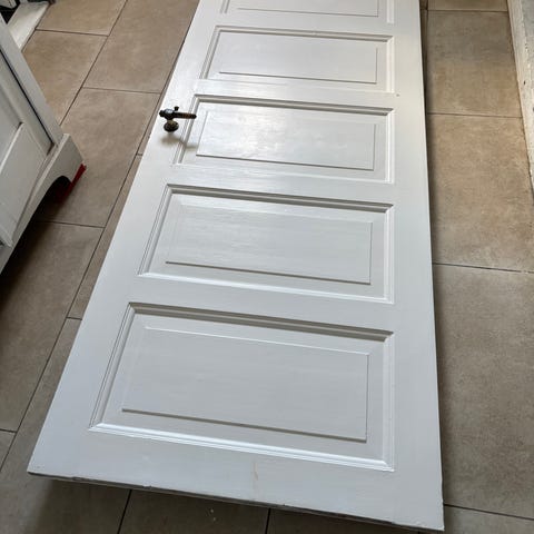 Hvid trædør med enkel lås og håndtag. Døren har en klassisk paneldesign og er velegnet til indendørs brug, for eksempel til opbevaringsrum eller kælderadgang.