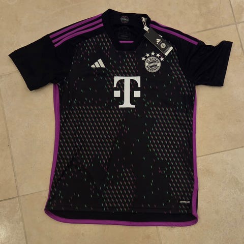 Adidas FC Bayern München fodboldtrøje i størrelse L til mænd. Trøjen er rød med hvide detaljer og ubrugt.