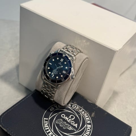 Omega Seamaster 300m Diver ref 25418000 fra 1999. Kommer uden tilbehør. Fremstår i pæn stand med alm. aldersrelaterede brugsspor. Fullsize modellen i 41 mm med quartzværk. Netop denne reference er Omegas første James Bond ur, som blev brugt af Pierce Brosnan i filmen GoldenEye (1995). Et identisk blå Seamaster 300M blev også brugt i de efterfølgende tre 007-film med Brosnan, men dog i en mekanisk udgave.
