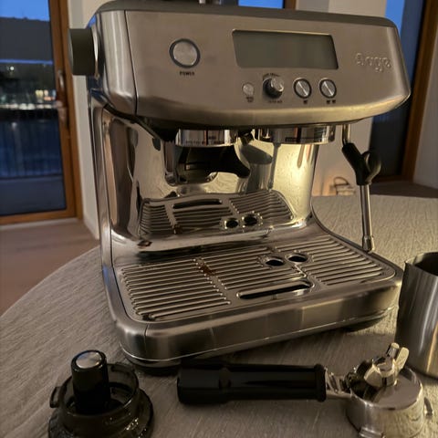 Breville Barista Pro espressomaskine i rustfrit stål med indbygget kværn og digitalt display. Maskinen er designet til at brygge espresso med præcis temperaturkontrol og har en dampstav til mælkeskumning.
