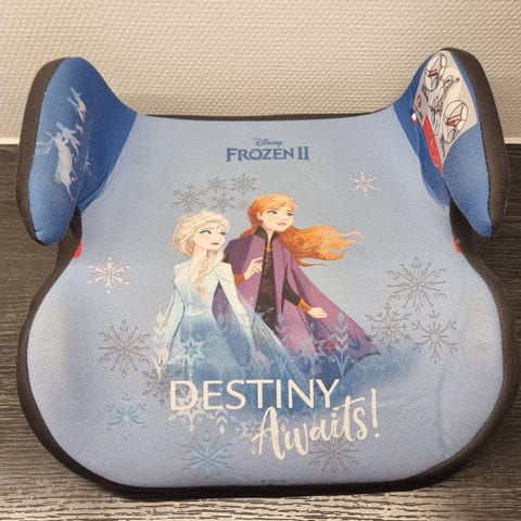 Autostol 15-36 kg med Anna og Elsa. Hovedstøtten kan justeres, ryggen kan tages af, så det blot bliver til en selepude (se billeder).