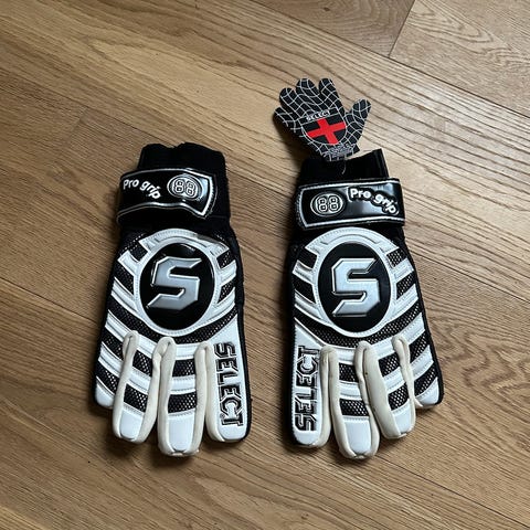 Handske nr. 2 i hvid/blå er brugt en énkelt gang, og sidder som en str. 9 hybdrid cut skal. Denne er udstyret med Adidas populære URG 2.0 latex som flere professionelle bruger. Derudover har den også en latex-strop af samme grund som den forrige handske.