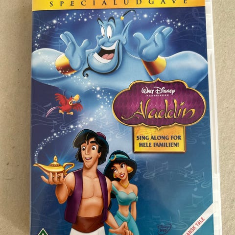 Walt Disney Aladdin DVD med sing along-funktion, indeholder alle sangtekster til filmens musiknumre. DVD'en har undertekster på flere sprog og inkluderer sange som 'Et helt nyt liv', 'Arabians Nat', 'En ven som mig', 'Et skørt fjols' og 'Prins Ali'.