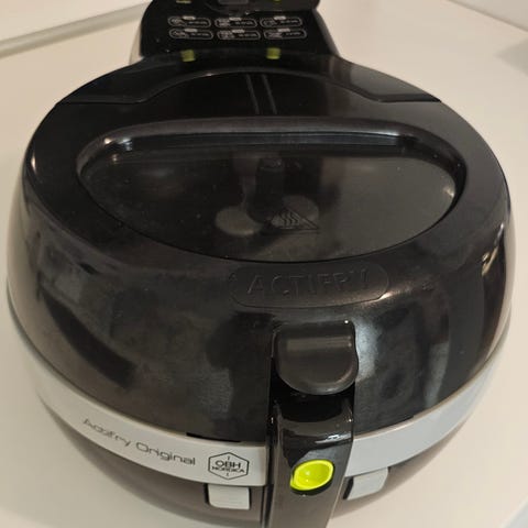 Tefal ActiFry 2in1 Airfryer med kapacitet til 1,5 kg mad. Sort farve. Materiale inkluderer plastik og metaldele. Designet til tilberedning af mad med varmluft og minimal olie. Indeholder to lag til samtidig tilberedning af forskellige fødevarer.