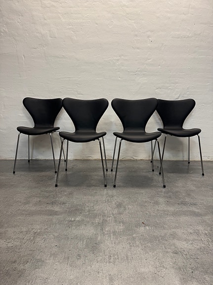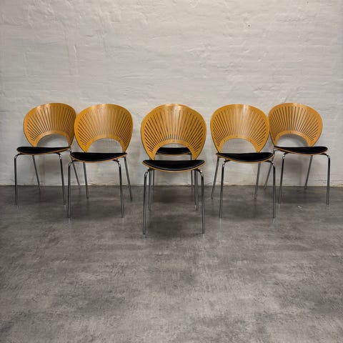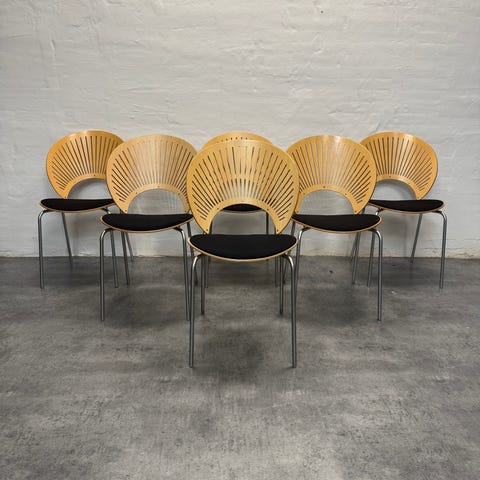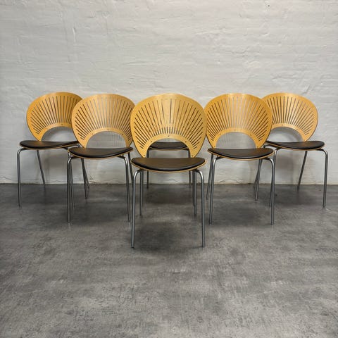 Super flotte og klassiske Trinidad stole, i bøgetræ, alle med polstret sæde hhv i sort læder, sort stof eller ruskind.