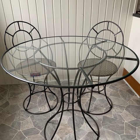 Bord med glasplade og hvidpudsede sokkelben. Passer perfekt som havebord, lille spisebord i køkken, arbejdsbord m.m. Har stået ude, så trænger til lidt vask. Har ikke foto p.t. Sælges med eller uden 2 stole - Pris samlet 1400 eller bord alene 1200 kr.