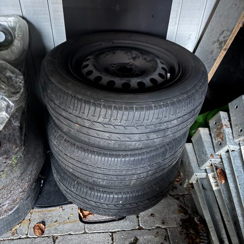 4 stk. stålfælge med sommerdæk. De er brugte men i ok stand. se billederne. Der er 5 mm mønster på dækkene, men nemt at skifte til vinterdæk. Dæk og fælge hedder 175/65r14. Kan leveres i Aalborg.
