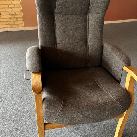Komfort senior hvilestol i stof og lyst lakeret bøgetræ