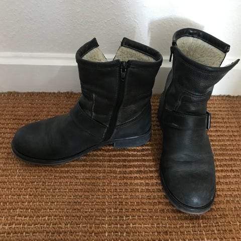Støvlen er designet med rund snude og chunky plateau sål. Skoen lukkes med lynlås og har guldspænder på siden.