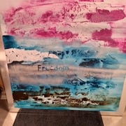 Niels Clemmensen maleri med titlen 'Freedom'. Farverne inkluderer primært røde, blå og hvide nuancer. Maleriet har et abstrakt udtryk med teksturen tydeligt synlig.