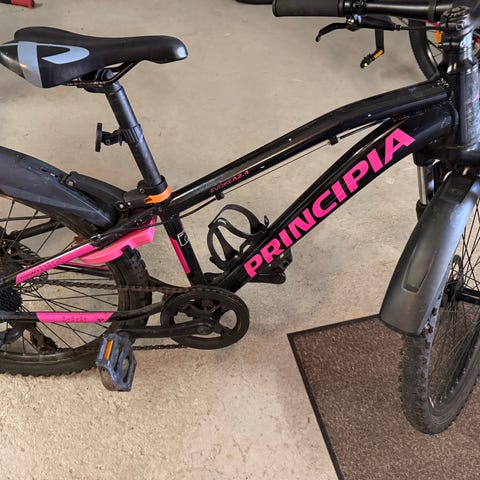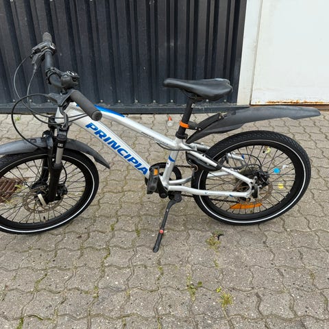 Principia A2.4 børnecykel med 20 tommer hjul. Cyklen er orange med grønne detaljer og har forgaffel med affjedring. Den er udstyret med skivebremser og gearsystem. Ramme og stel er designet til børn. Cyklen passer til et barn fra ca 7-10 år.