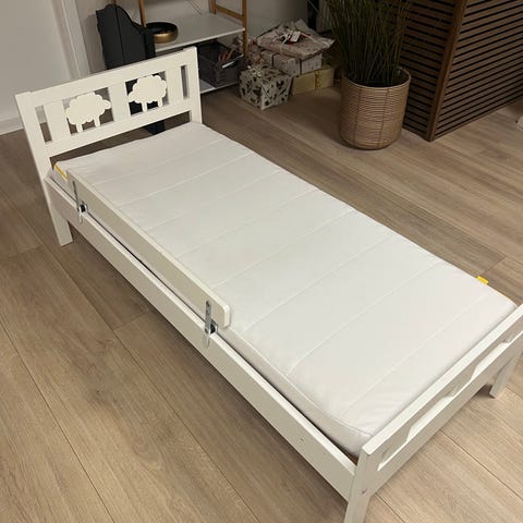 IKEA Juniorseng i hvid træ designet til børn. Sengen har en enkel ramme med lamelbund og et tilhørende madras. Den er velegnet til børneværelser og tilbyder en stabil og funktionel soveplads for børn. Den har et lille mærke/hak i det ene hjørne, men er ellers i fin stand. Sengen måler 70x160 cm. Madras kan medfølge.