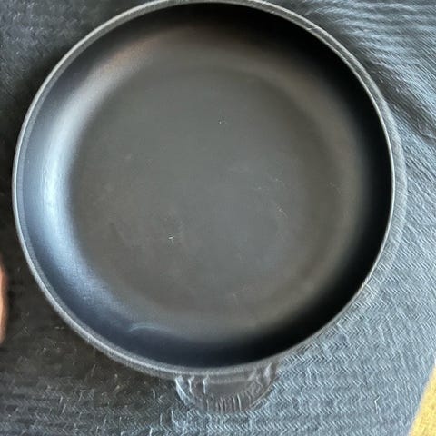 Grå Le Creuset støbejernspande med små afslag i emaljen.
