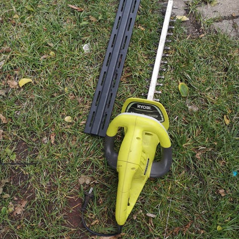 Ryobi RHT1851H20 hækkeklipper med teleskophåndtag. Produktet er designet til beskæring af hække og buske. Farven er gul og sort. Batteridrevet model, der tilbyder fleksibilitet ved brug uden ledning.