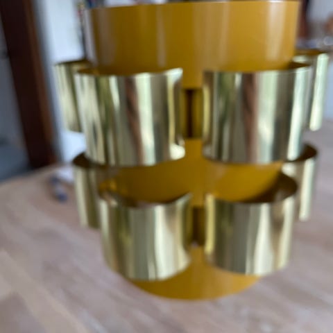 To små pendler, som består af seks lodrette og buede lameller i skiftevis messing og brun med hver to små øjne langs den nederste kant. Til sammen giver det er smukt lys omkring lamperne.