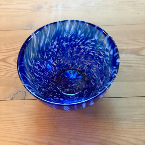 Ukendt blå glas skål med bølget design. Skålen har en kombination af blå og klar glas, hvilket giver et dekorativt udseende. Velegnet til brug som pynt eller til opbevaring af genstande.