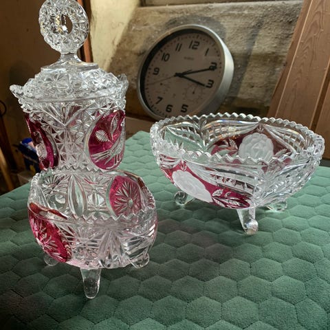 Sæt bestående af krystal sukkerskåle med låg. Skålene har dekorative fødder og mønstrede låg med håndtag. Materialet er klart krystalglas, designet til opbevaring af sukker eller småting.