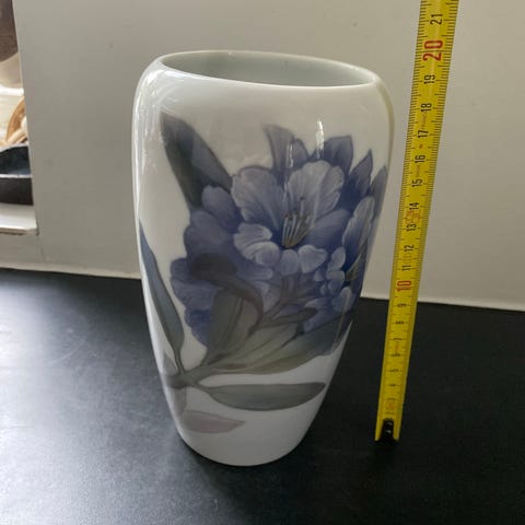 Royal Copenhagen første sortering. Blomstervase i porcelæn med et blåt og hvidt blomstermotiv. Vasen er dekoreret med blomsterdetaljer. Helt uden fejl.