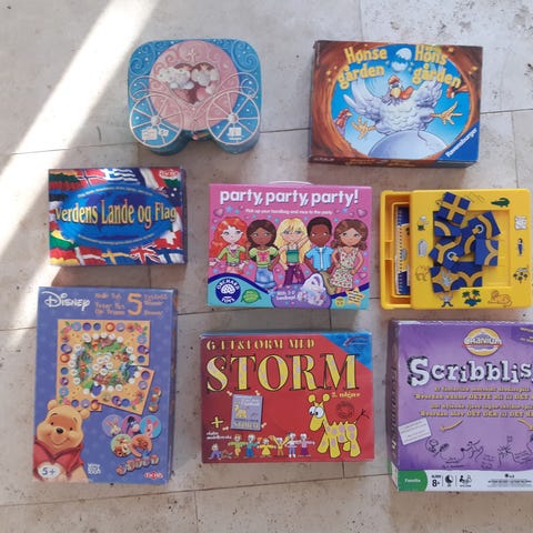 Samling af brætspil og puslespil bestående af Pie Face, Hiedbanz Charades, Twister, Speak Out, Poo Hat, Zoopanic samt et Ravensburger Disney puslespil med 1000 brikker.