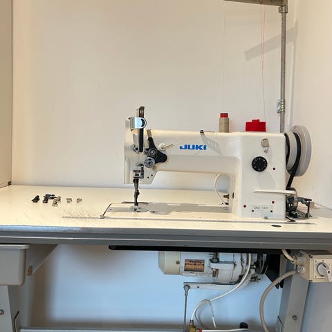 Juki DLN-415-4 industrisymaskine med digital Quick betjeningspanel. Maskinen er monteret på et arbejdsbord med motor og fodpedal. Velegnet til professionel syning og industrielle syopgaver.