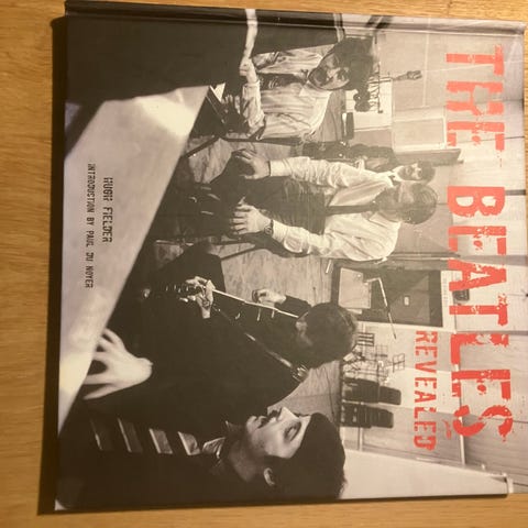 Bog med titlen "Beatles med deres egne ord" indeholdende sort-hvide billeder og tekst om bandet Beatles. Bogen indeholder interviews og citater fra medlemmerne samt beskrivelser af deres liv og karriere.