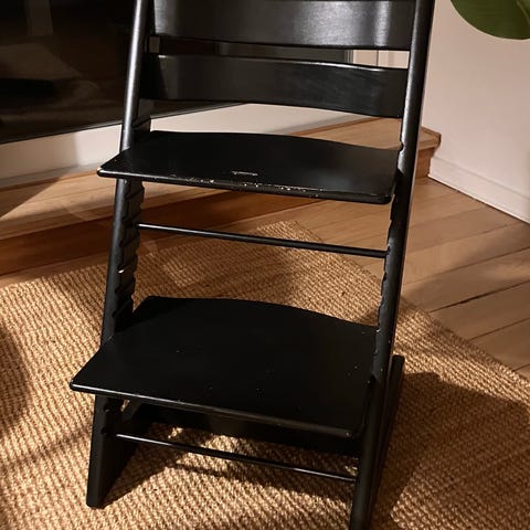 Rødmalet trip trap stol i god stand, men med en del overfladisk slitage og lidt malingpletter. Den røde maling er ikke original. Bøjle og andet udstyr medfølger ikke.
