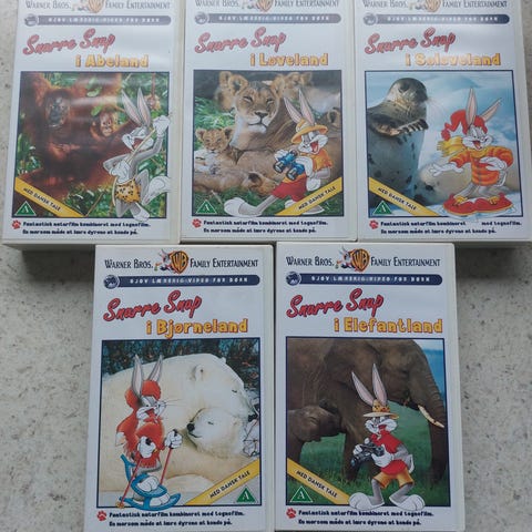 Elap Snurre Snup VHS video kassette med animationer, indeholder scener med kaniner og karakteren Elmer Fjøt. Videoen viser forskellige korte historier om Snurre Snup, herunder kaninkraft, kaninen som kom til middag, den forsvundne kanin og tid til kærlighed.