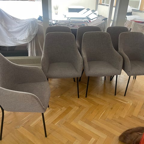 6 stk brugte spisebordsstole, som skal have nyt betræk og 2 stole skal gåes igennem i samling, ellers er stole i god. Stole er ikke nye og sælges derfor som brugte, derfor kan der forekomme ridser, slid og skrammer. Prisen er kun 900kr.