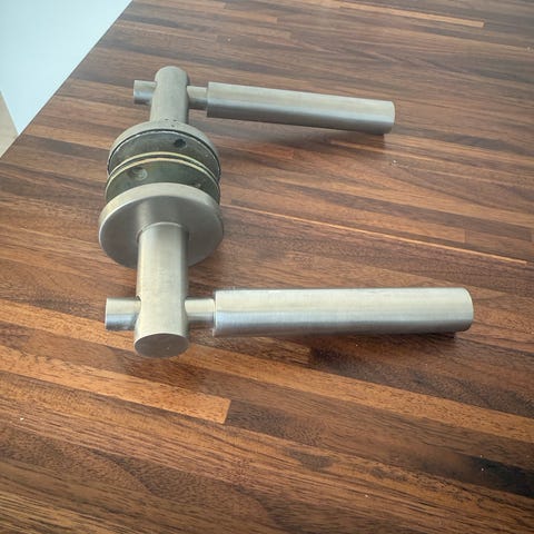 Sæt med vintage metal dørhåndtag og låsemekanisme. Indeholder to dørhåndtag og tilhørende låsemekanisme, velegnet til døre. Materialet er metal, og designet er klassisk.