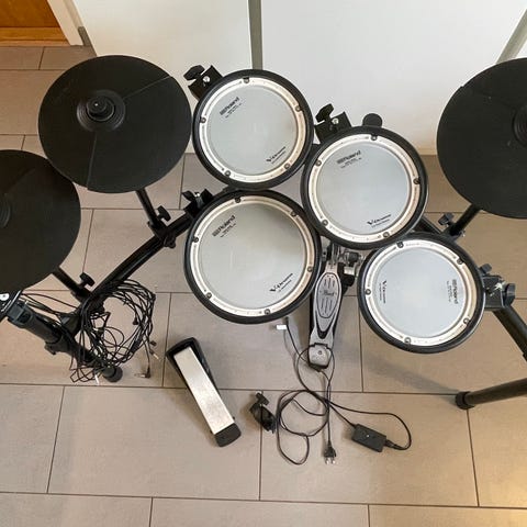 Roland V-Drums elektronisk trommesæt med 4 x PD-8 trommepuder, 2 x CY-8 bækkener, 1 x PD-85 lilletromme, 1 x KD-8 stortromme med pedal, 1 x FD-8 Hi-hat pedal samt 1 x PM-01 trommemonitor (højtaler)