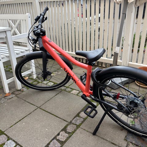Woom 6 letvægts børnecykel med 8 gear. Denne cykel har aluminium stel og er derfor superlet. Rigtig god stand. Er udstyret med speedometer, skærme, bagagebærer, godkendt lås med to nøgler og alle lovpligtige reflekser. 3 år gammel. Kvittering haves.
