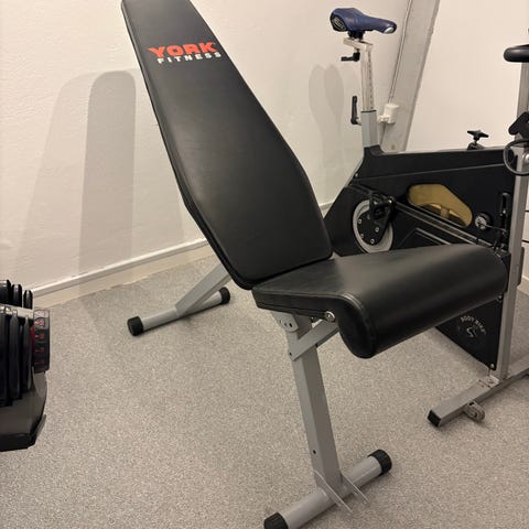 Bænken kan justeres efter højde, har glidende vippefunktion med håndtag og kan foldes sammen for nem opbevaring.