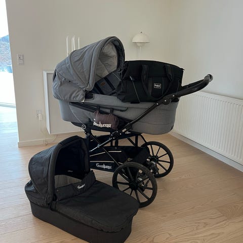 Emmaljunga barnevogn med tilbehør. Barnevognen er brugt til ét barn og sælges med følgende ekstraudstyr: klapvogndel emmaljunga autostoldele,lift, pusletaske, barnevognsparasol, madras til barnevogn samt madras til lift.
