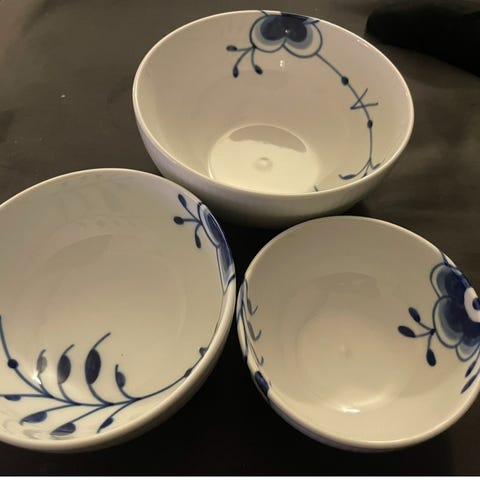 Blue Fluted Mega 37 CL Musselmalet Riflet skål med blåmalet mønster på hvid porcelæn. Skålen har en klassisk, riflet kant og er velegnet til servering af mad eller som dekorativt element i køkkenet