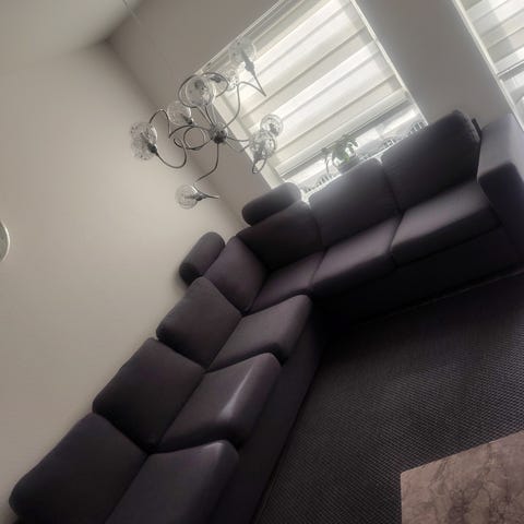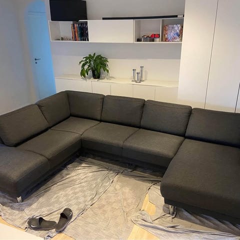 Virkelig behagelig hjørnesofa i mørkegrå stof. Sofaen er grundigt vasket og fremstår ren og velholdt. Den kommer fra et hjem uden dyr og uden røg.