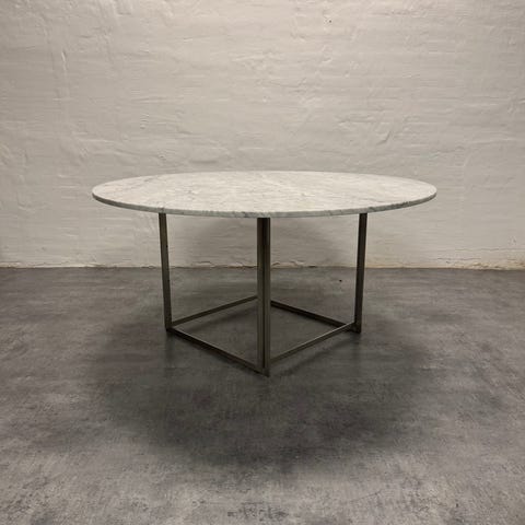 Bordet består af et stel i metal samt bordplade af hvidt marmor, designet af Poul Kjærholm.